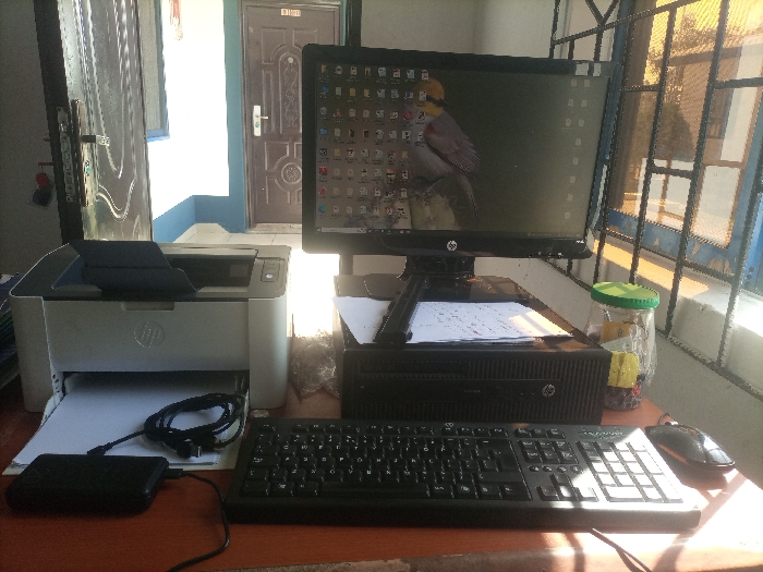 The image depicts an indoor workstation setup on a wooden desk. A white HP LaserJet printer, loaded with paper and a coiled black USB cable, is positioned on the left. Adjacent to it on the desk are a black external storage device, a black HP desktop computer tower with a piece of paper resting on its top surface, and a black HP flat-screen monitor displaying a bird-themed desktop wallpaper with numerous icons. A black QWERTY keyboard and a black computer mouse are arranged in front of the tower and monitor. To the right of the computer tower, a clear glass jar with a green lid containing small dark objects is visible. Natural light streams in from a window on the right, which features black metal security grilles. In the background, an open doorway on the left reveals a brightly lit area. A closed brown patterned door with a visible label "B101" or "B111" is centered in the background, set against walls painted light blue at the lower section and white above. No individuals are present. The scene is located in the city of Unknown, Unknown.