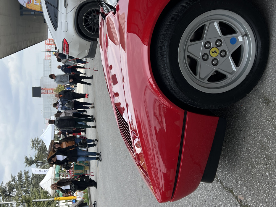 The scene depicts an outdoor public event, likely a car show or market, taking place on a paved surface under an overcast sky at what appears to be the International Fair Plovdiv grounds in Plovdiv, Bulgaria. In the immediate foreground, the front-right section of a highly polished, bright red Ferrari sports car is prominently featured. This vehicle exhibits a vented hood, black lower body trim, and a five-spoke silver alloy wheel. The wheel's center cap displays a yellow emblem with the black Ferrari prancing horse logo, and a small blue circular sticker is affixed to one of the spokes near the tire valve. Behind the red Ferrari, a diverse group of approximately 15-20 casually dressed individuals are observed walking in various directions across the paved area. Their attire includes jackets, jeans, and sneakers. To the left of the pedestrian activity, several white pop-up tents with visible banners indicate vendor stalls or display areas. To the right, a white Mercedes-Benz GLE Coupe SUV with black multi-spoke wheels is partially visible, parked beneath a large architectural overhang. Red metal stanchions are situated between the Ferrari and the Mercedes-Benz. The background includes sparse trees, a large dark rectangular display screen or billboard, and further indistinct pedestrian activity, all under a consistent, grey, cloudy sky.