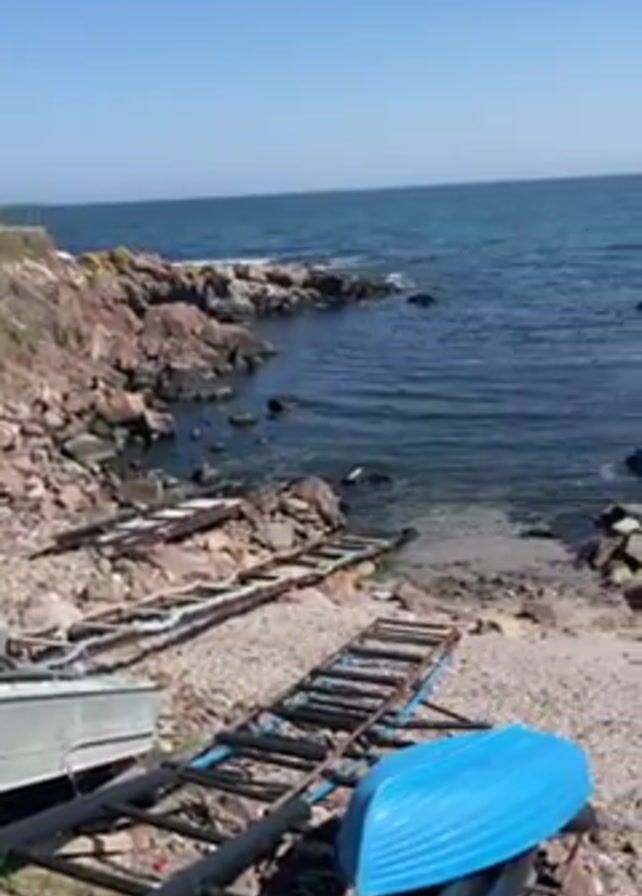 rocky coastline with boats and a boat ramp. The sky is blue and clear. The water is dark blue in some areas and turquoise in others. The camera pans to the right, showing more of the coastline and a town in the distance. There are rocks in the water and on the shore. There is a set of stairs leading down to the beach.