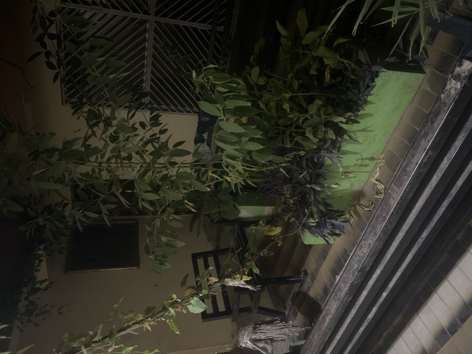 An outdoor scene, viewed from below, features plants and architectural elements. The upper left shows a window with a lattice pattern. Foliage dominates the frame, with a variety of plants including long-leafed green plants, some with purple tinges. A window and chair are visible in the background. A staircase with dark railing is in the lower right, adding depth to the scene. A textured, broom-like object sits at the base of the stairs.