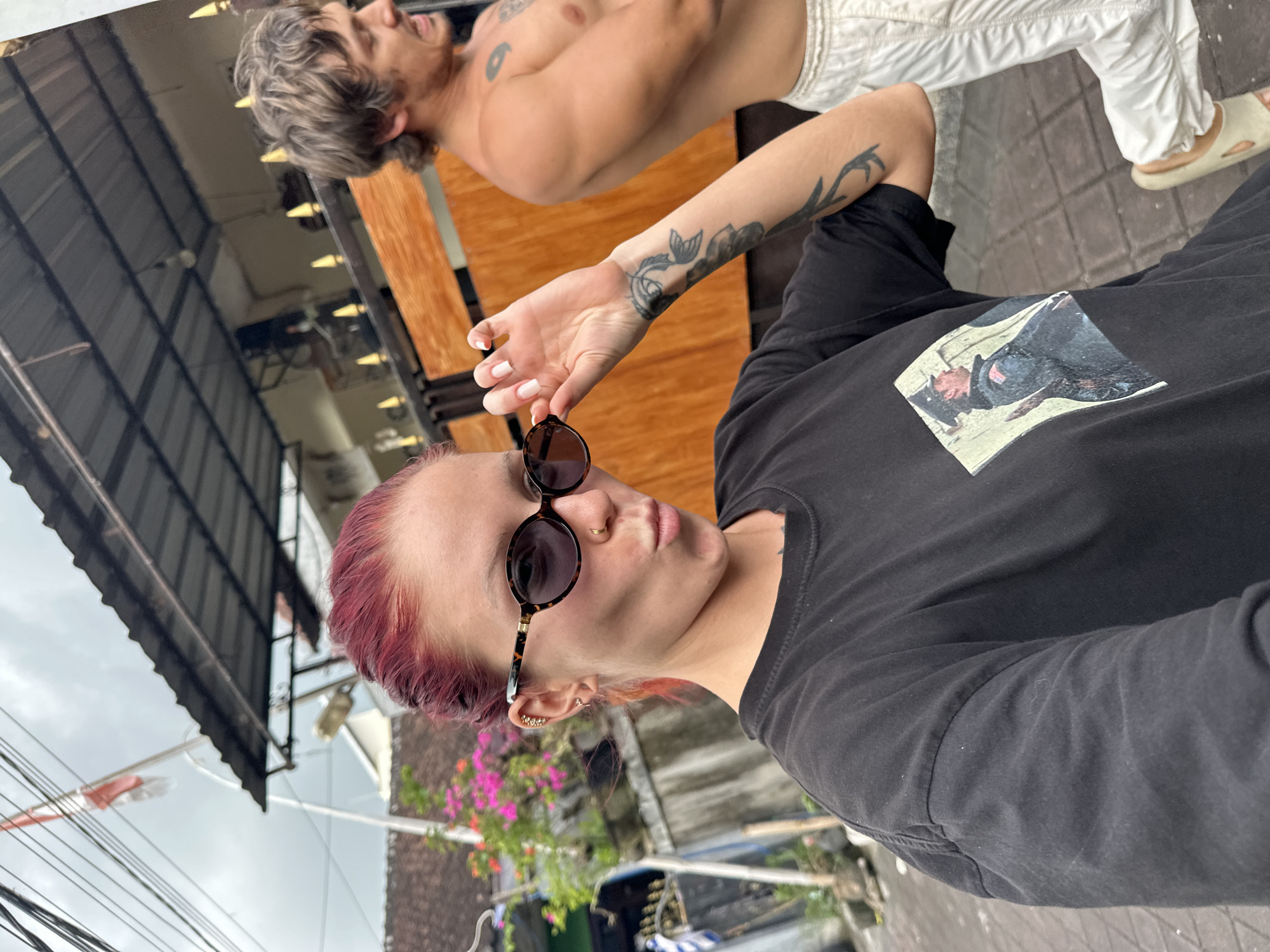 The scene depicts two individuals outdoors in a residential area of Buduk, Indonesia, under an overcast sky. In the foreground, a fair-skinned female with red hair faces the camera, her lips puckered. She wears small, oval, tortoiseshell-patterned sunglasses, which she holds at the right temple with her right hand. Visible on her left ear are multiple piercings, and a black tattoo resembling a vine or floral pattern extends along her right forearm. She is dressed in a black short-sleeved t-shirt featuring a graphic print of a uniformed male figure. Behind her, to the right and partially cropped, a shirtless male with light brown, wavy hair is present, facing right with his mouth slightly open. He wears white pants and light-colored slip-on sandals. A dark, circular tattoo is visible on his left shoulder. The background features a street or pathway made of grey pavers, bordered by a fence with dark vertical bars, gold spiked finials, and a wooden panel. Beyond the fence are residential buildings with dark corrugated roofs, a visible utility pole, multiple overhead wires, and green foliage interspersed with pink flowering plants. An Indonesian flag, red and white, is displayed on a pole in the upper left background.