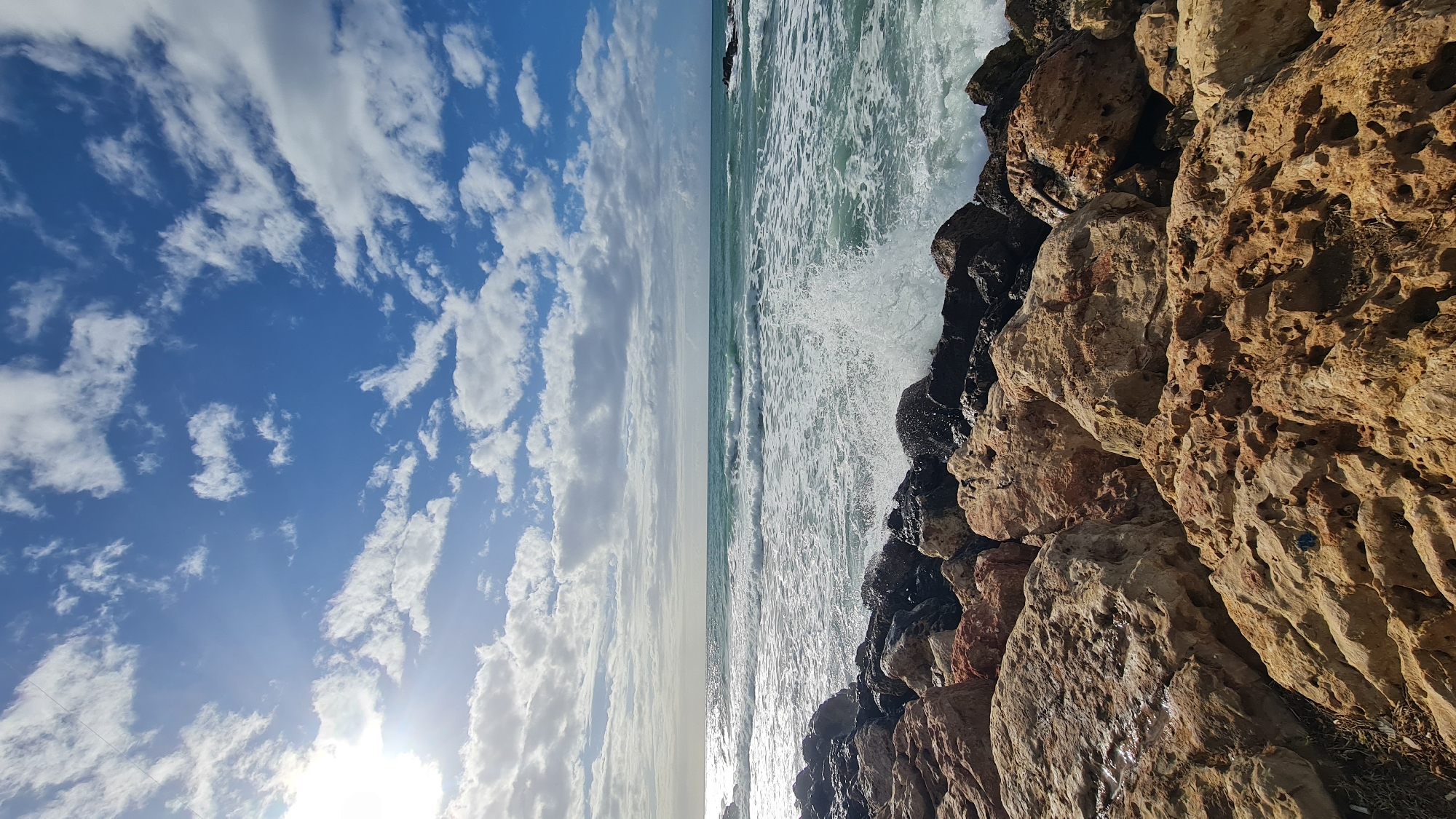 The image depicts a rocky coastline in Nahariyya, Israel. On the right, large, porous, tan-colored rocks form a barrier against the sea. Waves crash against the rocks, creating white splashes of water. The sea transitions from a light turquoise near the horizon to a more turbulent, white-flecked expanse closer to the rocks. On the left, a vibrant blue sky is filled with scattered white clouds. The sun is positioned near the bottom left corner, casting a bright light through the clouds. The horizon line is visible in the center of the image, separating the sky and sea.