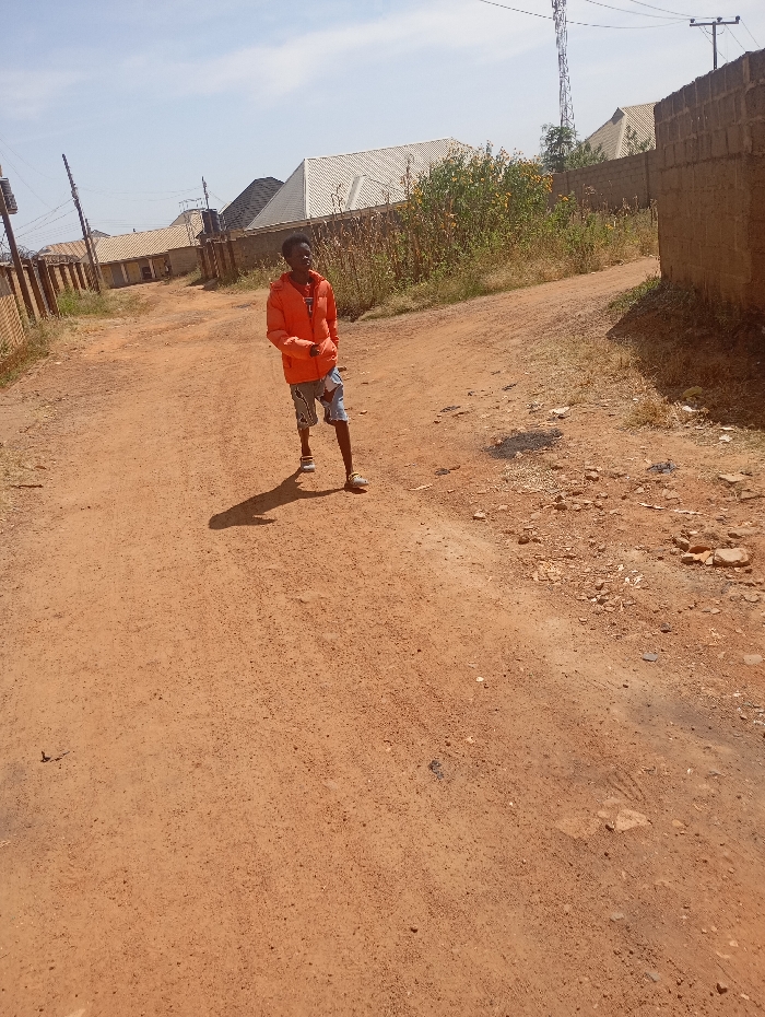 The image displays an unpaved, reddish-brown dirt road in Barakin Lerawi, Nigeria, under a bright, clear sky. A young male subject is positioned slightly left of center, standing with his body oriented slightly left of the camera and his head turned to gaze towards the left. He is wearing an orange hooded puffer jacket over a light-colored t-shirt, distressed blue denim shorts, and white and blue open-toed sandals. His stance causes a distinct shadow to fall to his right. The road surface is uneven, showing tire tracks and scattered small stones and debris. To the left, a fence constructed from wooden poles and wire separates the road from a row of residential buildings, identifiable by their corrugated metal roofs and visible utility poles with power lines. To the right, a concrete block wall runs parallel to the road, behind which dense, overgrown vegetation is present. In the background, beyond the vegetation, a tall lattice communication tower and additional residential roofs are visible under the clear sky. There are no other individuals or interactions depicted.
