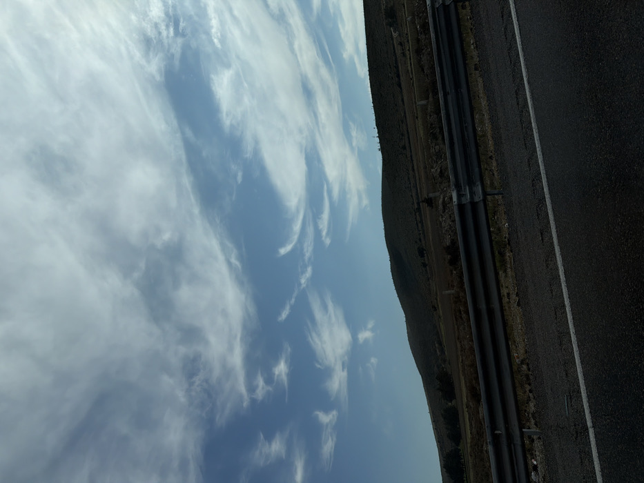 A road runs vertically along the right edge. Adjacent to it, a series of pipes follow the same trajectory. A small hill lines the pipes and road. The majority of the image is filled with the sky, populated by thin, white clouds scattered across a blue expanse. The orientation of the image is such that the sky appears on the left, while the land features are compressed to the right.