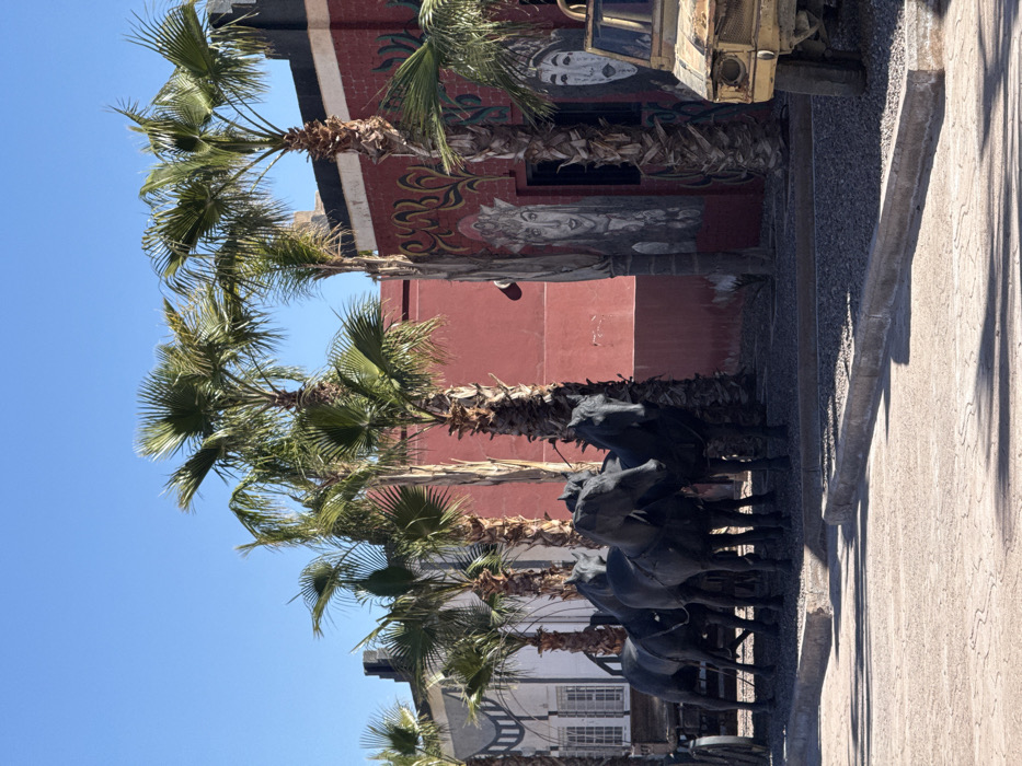 This image depicts a static outdoor scene in Ouarzazate, Morocco, under a clear blue sky. The foreground features a light-colored paved area with a subtle patterned texture, separated by a concrete curb from a dark gravel-covered section. On the left side of the gravel area, a group of at least four dark-colored horse statues, appearing to be harnessed, stand facing right, with a portion of a wooden cart or wagon visible behind the leftmost horse. Multiple tall palm trees with green fronds and rough brown trunks are distributed throughout the midground, casting shadows. In the background, two primary buildings are visible. The building on the left features a light-colored facade with rectangular windows and a dark, stepped roofline. The building on the right has a red-painted facade adorned with two distinct murals: the left mural depicts a woman's face with a headpiece, rendered in greyscale, while the right mural shows a stylized or masked face in similar tones. Black window or door frames are integrated into this red building. On the far right, partially obscured by a palm tree and in front of the red building, is the front section of a weathered, yellowish-tan vehicle, resembling a vintage off-road vehicle or jeep, with a visible headlight and tire. No people are present.