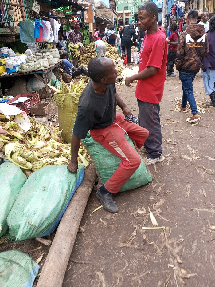 This image depicts a bustling open-air market scene in Nairobi, Kenya, characterized by the extensive display and sale of maize. In the foreground, two dark-skinned adult males are interacting. The man on the left, wearing a black t-shirt and red track pants with white stripes, sits on a large green sack while holding a black feature phone with a white cord in his right hand. He faces a standing dark-skinned man on the right, who wears a red t-shirt and dark grey pants, with his right arm slightly raised in a conversational or gestural manner. The unpaved ground is extensively covered with discarded maize husks and other organic debris. Large quantities of unhusked maize are piled directly on the ground and stored within multiple large green and yellow woven sacks. A substantial wooden log lies horizontally in the lower-left quadrant. In the mid-ground and background, numerous individuals are visible, engaged in various market activities such as walking, managing stalls, or handling produce. Informal market stalls, constructed from wood, corrugated iron, and fabric, line the street, displaying goods like clothing. Prominent signage for "M-PESA" and "PIGI WA KITI CO. LTD." is visible on background structures. The environment is dense, active, and indicative of a commercial hub focused on agricultural commodities.
