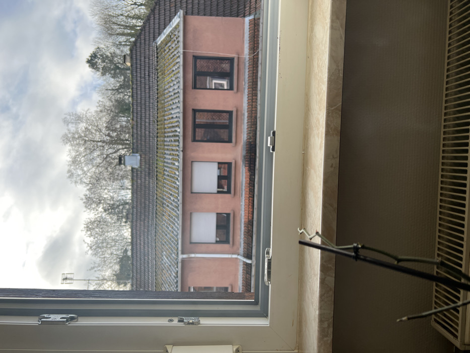The image depicts an outdoor residential scene in Sarreguemines, France, viewed from an indoor window. **Foreground:** A white-framed window is partially open on the left, revealing a light beige, mottled window sill. A white metal radiator is partially visible below the sill. A dark, slender plant stem with several nodes extends upwards from the lower left, partially obscuring the radiator. **Midground:** Directly across from the window, a two-story residential building with a coral-pink rendered facade is visible. Its dark, ridged tiled roof displays multiple patches of green moss and algae. Two windows on the upper floor's left side feature partially lowered white roller shutters. To their right, two additional windows have dark frames; the rightmost of these reflects a partial white, rectangular object. A white downspout runs vertically along the left side of the pink facade. A lower, reddish-brown tiled roof is positioned between the viewer's window and the pink building. **Background:** A line of leafless deciduous trees extends horizontally across the upper portion of the frame, beneath a partially overcast sky. A metallic antenna structure is visible behind the trees on the far left. A single chimney protrudes from the roof of the pink building near its center. No people, actions, or direct interactions are visible within the frame. The environment is an urban or suburban residential area under daylight conditions.
