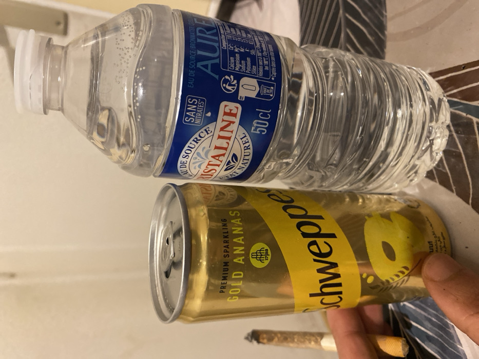 50 cl bottle of Cristaline water labeled "Eau de Source," indicating spring water with "sans nitrates." Below is a gold Schweppes can of premium sparkling Gold Ananas. In the foreground is a lit cigarette or joint, held by a person's fingers. The composition suggests a relaxed, informal setting, possibly on a table or flat surface. The presence of beverages and a smoking item indicates a leisure activity.
