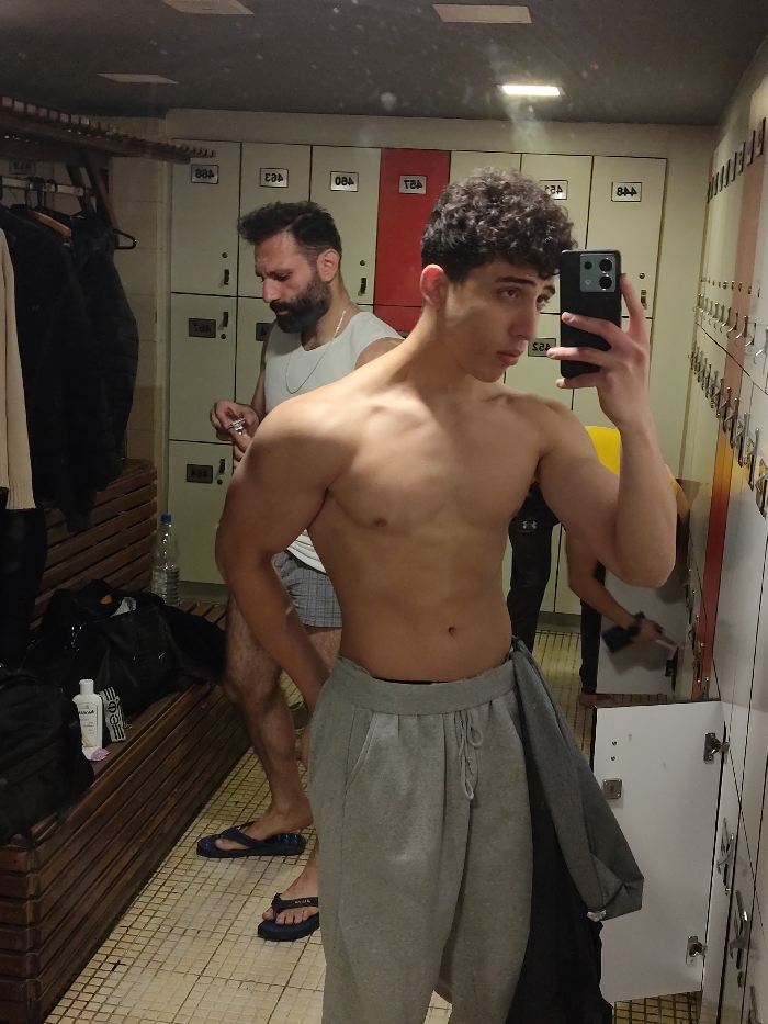 In a gym locker room, a muscular, shirtless young man with curly hair takes a selfie, showcasing his physique