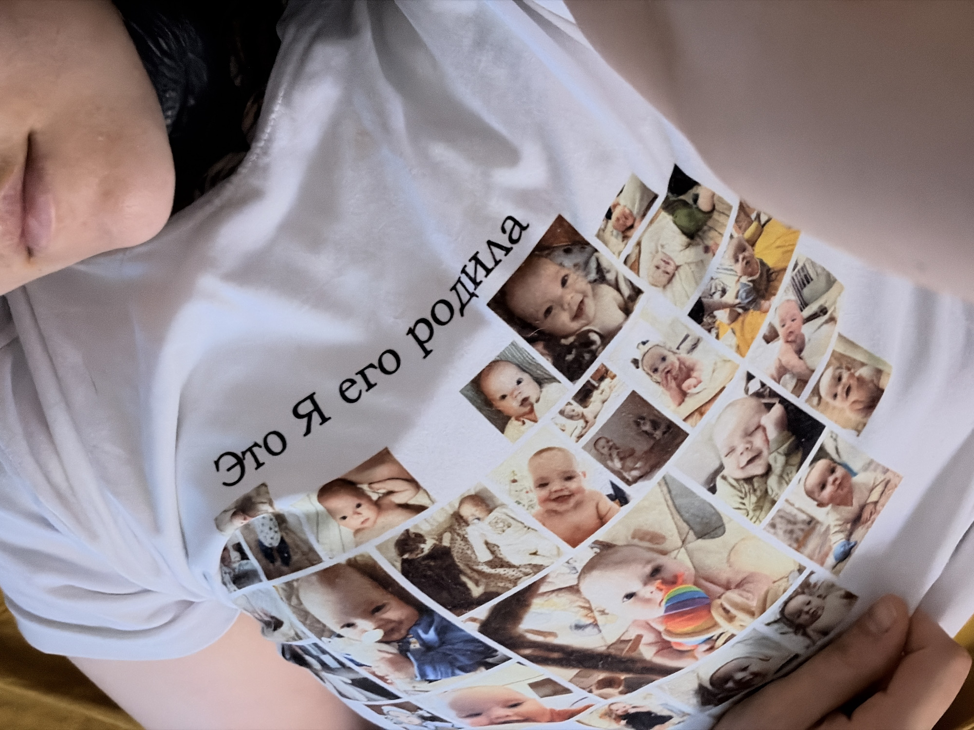 A person is wearing a white t-shirt with a collage of baby pictures on it. Above the pictures, in Cyrillic script, are the words "Это Я его родила", which translates to "I gave birth to him". The person's face is partially visible, showing their lips and chin. The background is a soft, golden color. The location is Chaikovsky, Russia.
