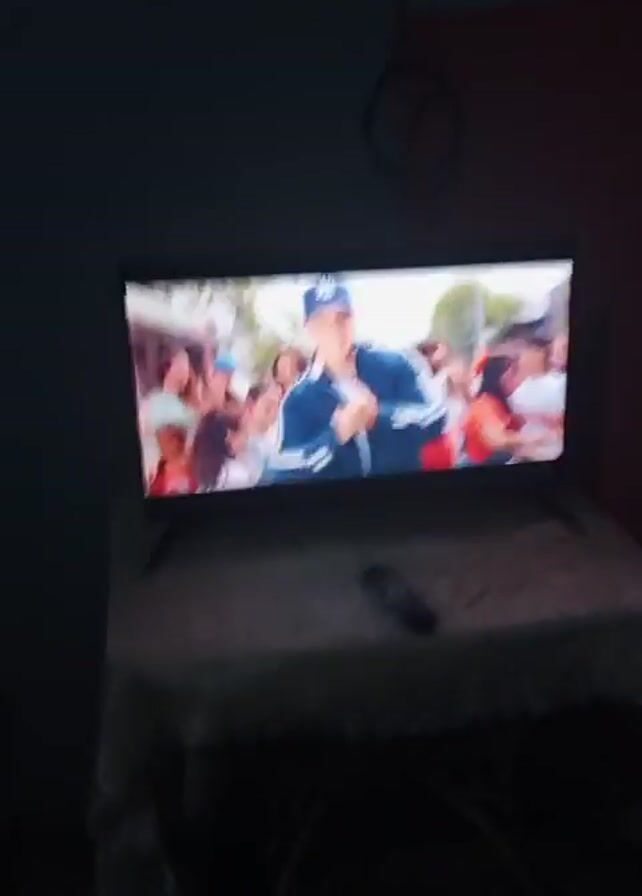 A TV rests on a white, lace-covered table. The screen is lit, displaying a music video with vibrant, light-filled scenes of a crowd dancing. A remote control is placed on the table in front of the TV. The room is dimly lit, with a dark wall and cables visible in the background.