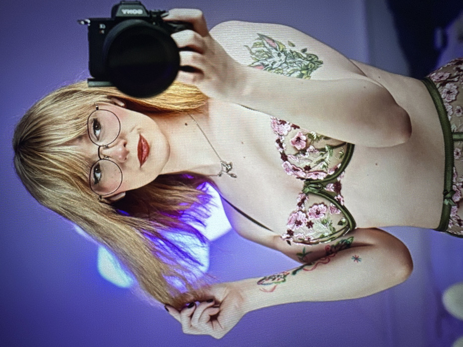 A fair-skinned individual with shoulder-length blonde hair and bangs, wearing round spectacles with dark frames and red lipstick, is depicted from the waist up. She wears a sheer, light beige bra with intricate pink floral and green leaf embroidery, and matching partially visible lower lingerie with a green trim. A delicate silver-colored necklace with a pendant is visible. On her right arm, a colorful tattoo of a serpentine or vine-like design is present, along with a small asterisk symbol. On her left upper arm, a green tattoo resembling a stylized animal head composed of leaves is visible. The individual holds a lock of her hair with her right hand and holds a black digital camera (partially showing "SIGMA" branding) with a large lens in her left hand, pointing it towards herself as if taking a selfie or mirror shot. The background is uniformly purple/lavender, with soft, out-of-focus light sources, indicating an indoor studio or controlled lighting environment. There are no visual cues within the image to determine the specific location in the city of Jos, Nigeria, or any other geographical location.