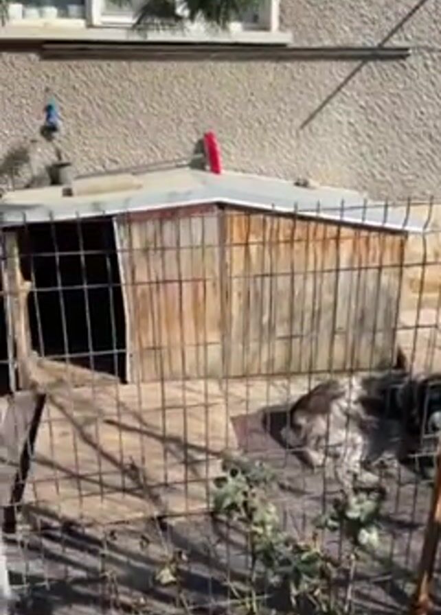 n outdoor scene with a dog lying in a caged area next to a wooden doghouse