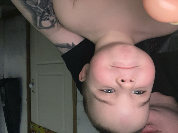 The image depicts a young child positioned in the foreground, facing the viewer with a neutral expression and slightly pouted lips. The child, appearing to be a toddler, has fair skin, rosy cheeks, and light-colored eyes, and is shirtless. A blurry, rounded, light orange object is partially visible in the lower left corner. Partially visible behind the child's left side is an adult, wearing a black shirt. A tattoo depicting a skeletal figure is prominent on the adult's right forearm. The background reveals an indoor setting, presumably a room in the city of Павловка, Russia. A light-colored door with a white doorknob is situated to the right. Above the door, a yellow fabric piece with cartoon motifs is attached to the wall, and to the immediate right of the door, a dark garment hangs on the wall.