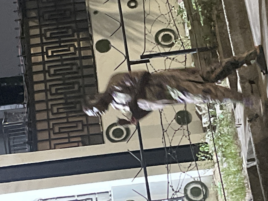 An asymmetrical, blurry image shows a building at night. It features decorative ironwork on the left and a wall decorated with circles. A long, undefined, brown figure or sculpture is suspended in front of the building. Some vegetation is visible along the right edge. The photo's perspective is angled, possibly taken from below and tilted.