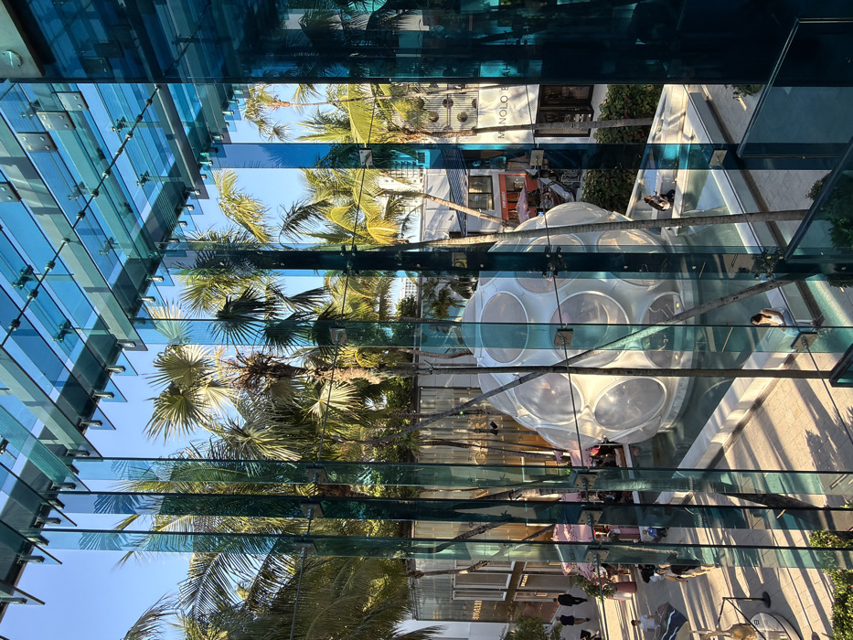 - "The image depicts an outdoor pedestrian plaza within the Miami Design District, Miami, Florida, USA, viewed from an elevated position through a modern architectural structure composed of vertical and horizontal blue-tinted glass panels" by FM-DpkOH3, licensed under CC BY 4.0