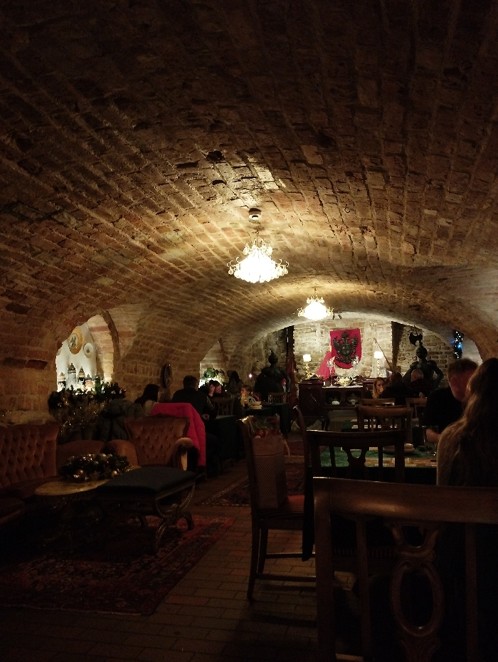 The scene depicts a dimly lit subterranean restaurant or tavern interior, likely *Medininkai Restaurant* in Vilnius Old Town