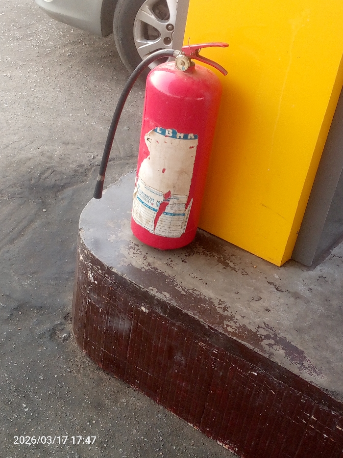 A red, cylindrical fire extinguisher stands upright on a faded concrete surface in Lokoja, Nigeria