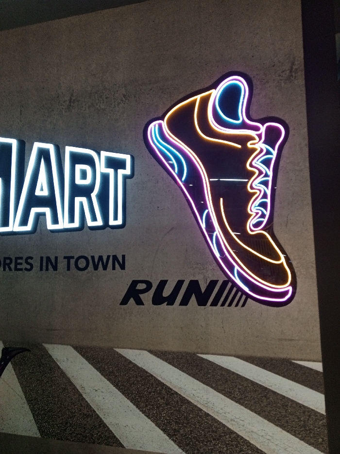 An exterior shot, likely taken at night, displays a section of a building in Sandhikharka, Nepal. The primary subjects are illuminated signage on a textured, light-grey wall. On the left, partially visible, are large, glowing blue-white neon letters spelling "MART." Below this, dark, non-illuminated text reads "ORES IN TOWN." To the right and slightly above the center, a prominent neon sign depicts the silhouette of a running shoe, outlined in glowing yellow, blue, and purple light. Below the shoe, dark text states "RUN" followed by four parallel vertical lines. The lower quarter of the image shows a ground surface, possibly a walkway, characterized by dark, speckled aggregate intersected by bold, white diagonal stripes. No individuals or active interactions are present in the scene.