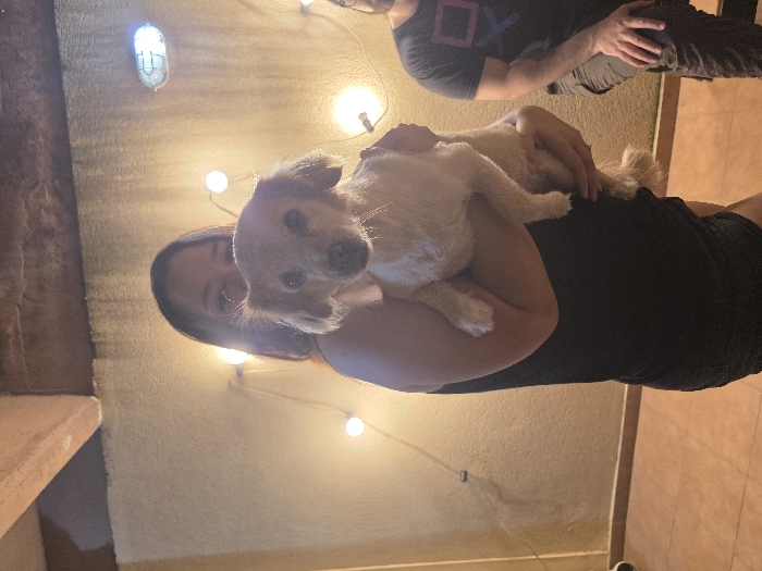 A woman in a black dress holds a light-colored puppy. The dog has floppy ears. Another person in a dark t-shirt with a pink PlayStation logo stands nearby. Both are inside a home. String lights illuminate the scene. The background features textured walls and tiled flooring.
