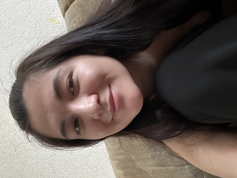 A single individual is depicted in a close-up, indoor setting. The subject, a person with dark hair and light brown eyes, is looking directly at the camera with a subtle smile. Their skin appears clear and even-toned. Dark clothing, possibly a top or pants, is visible at the lower portion of the frame, with what appears to be a knee drawn upwards. The background consists of a light-colored, textured wall, possibly wallpaper, featuring a faint repeating pattern. To the subject's right, a portion of a light brown, upholstered surface with a quilted or patterned texture is visible, suggesting a sofa or armchair. A small, irregular yellow mark is present on the textured wall in the upper left quadrant of the image. The specific geographical location within Kurovskoye, Russia, is not discernible from the visual evidence provided.
