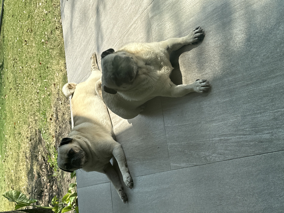 - "The scene depicts two fawn-colored pugs resting on a light grey tiled patio, located in Monterrey, Mexico" by FM-2UUjz2, licensed under CC BY 4.0