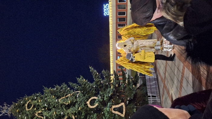 The image depicts a nighttime festive scene in a public square in Ignalina, Lithuania. A large, decorated Christmas tree, adorned with string lights, gold and silver baubles, and wooden-style ring and bell ornaments, stands prominently on the left, enclosed by a white picket fence at its base. In the center, a street performer, costumed as an angel with large golden, tinsel-like wings and a halo effect around their head, stands on a small, illuminated white platform. This figure, dressed in a light gold or cream-colored full-body costume, interacts with a child in a bright yellow winter jacket and a grey knitted hat, whose hands are positioned near the performer's. In the immediate foreground, partially visible onlookers include an individual on the left wearing a black beanie and dark clothing, and another on the right in a dark jacket and hat, with a furry collar visible below. The ground is paved with reddish-brown tiles in a patterned arrangement. In the background, a light-colored building features a string of yellow lights along its roofline, and the illuminated blue numbers "2025" are visible on its roof.