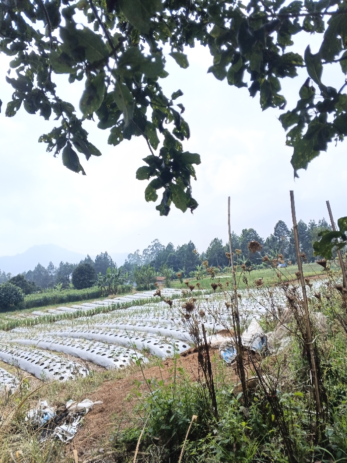 This image displays an agricultural landscape in Nam Sa Lat, Myanmar, under an overcast, light gray sky. In the upper foreground, dark green foliage, exhibiting multiple holes consistent with insect damage, partially frames the scene. The lower foreground consists of dry brown vegetation interspersed with several vertical wooden poles and discarded white and blue plastic debris on the ground. A dirt embankment separates this area from a series of cultivated fields. These fields are characterized by numerous parallel rows covered with white plastic mulch sheeting, from which small green plants emerge through punched openings. Beyond the cultivated fields, a band of green trees and dense vegetation includes banana trees and a small, reddish-brown structure with a plume of white smoke rising to its left. The background reveals densely forested hills and mountains. No individuals or active interactions are visible.