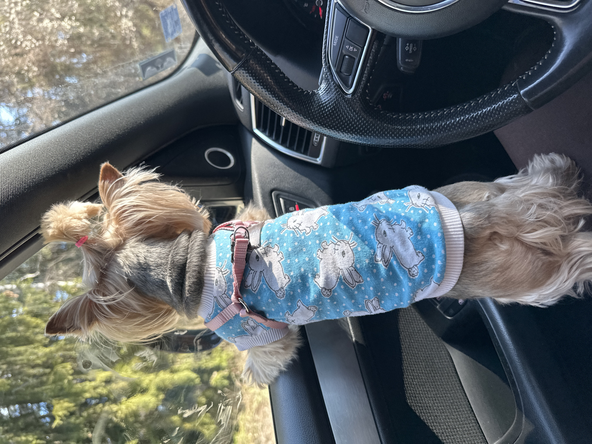 A small, brown and gray Yorkshire Terrier dog is positioned in the driver's seat of a vehicle. The dog is wearing a light blue sweater with white rabbit patterns and a light pink harness. The vehicle's steering wheel is visible in the upper portion of the frame. Outside the window, blurry green trees are visible, suggesting an outdoor environment, possibly while in Manastirishte, Bulgaria. The image appears to be taken from inside the vehicle, looking towards the driver's side.