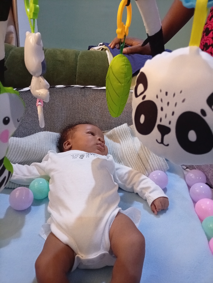 An infant, appearing of African descent, lies supine on a light blue blanket within a mesh-sided playard in an indoor setting in Abuja, Nigeria; the specific location within the city is not discernable. The infant wears a white long-sleeved bodysuit with a ruffled detail on the bottom and rests its head on a cream-colored knitted pillow. Its eyes are open and directed upwards towards an overhead mobile. Dangling from the mobile are multiple toys, including a prominent white plush toy with black features resembling a panda face, a green fabric leaf, and a white plastic animal figure. Small, pastel-colored plastic balls in shades of lavender, mint green, and pink are scattered on the blue blanket around the infant. In the background, partially obscured behind the playard, the hands and forearms of an adult with dark skin are visible, resting on a dark green upholstered cushion. The adult wears a dark blue garment and a patterned fabric. The visible background wall is a solid light green. The infant is observed looking at the mobile; no direct interaction between the infant and the adult is depicted.