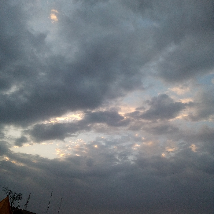 A dramatic sky dominates the view, filled with a thick blanket of gray clouds. Hints of light peek through the clouds, creating small patches of brightness. Below, a sliver of land is visible, marked by a few trees and indistinct structures. The overall mood is somber, suggesting an impending storm.