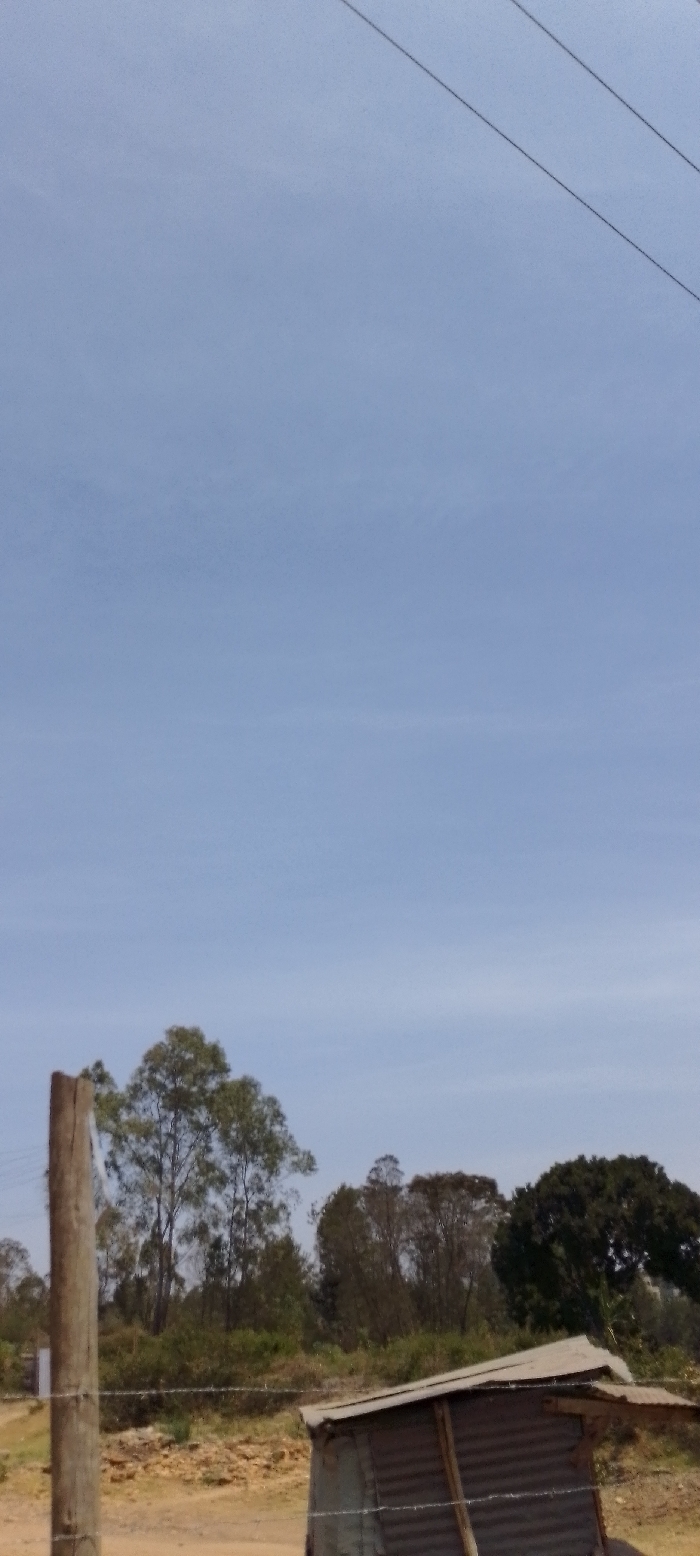 A landscape view captures a small corrugated metal shack in the foreground, partially obscured by a weathered wooden utility pole. Trees and foliage line the horizon, adding depth to the scene. The sky dominates the upper portion of the image, a pale blue canvas subtly streaked with wispy clouds. Power lines cut diagonally across the top right corner, providing a linear contrast to the natural elements below.