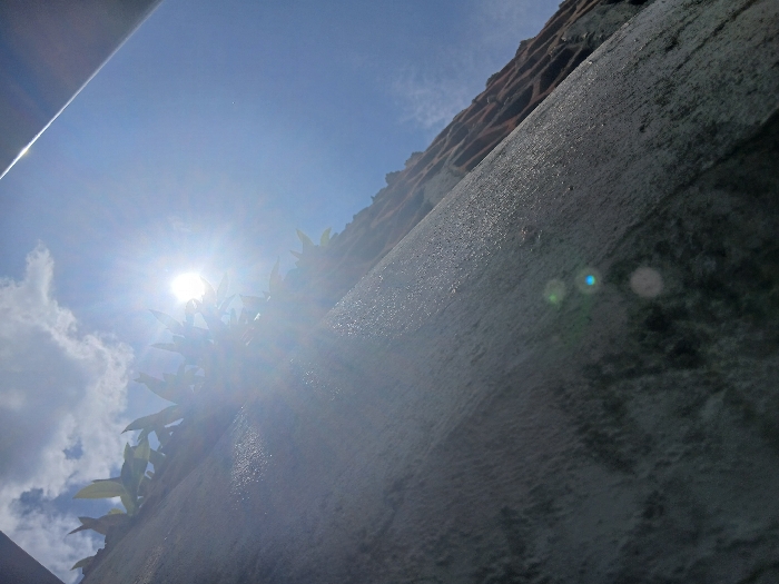 An upward-angled outdoor photograph captured in Ongata Rongai, Kenya, features a dominant, textured, dark grey concrete surface extending diagonally from the lower-left. This surface exhibits wetness and minor particulate matter. Along its upper edge, several green, spiky-leaved plants are visible, silhouetted against a bright blue sky. A prominent, intense sun in the upper-center creates a strong lens flare and starburst effect, partially obscuring the plants and illuminating sparse white clouds in the upper-left. A diagonal dark structural element and a portion of a reddish-brown, patterned building facade are discernible on the far right. No individuals or specific actions are present. The scene is under direct, strong sunlight.
