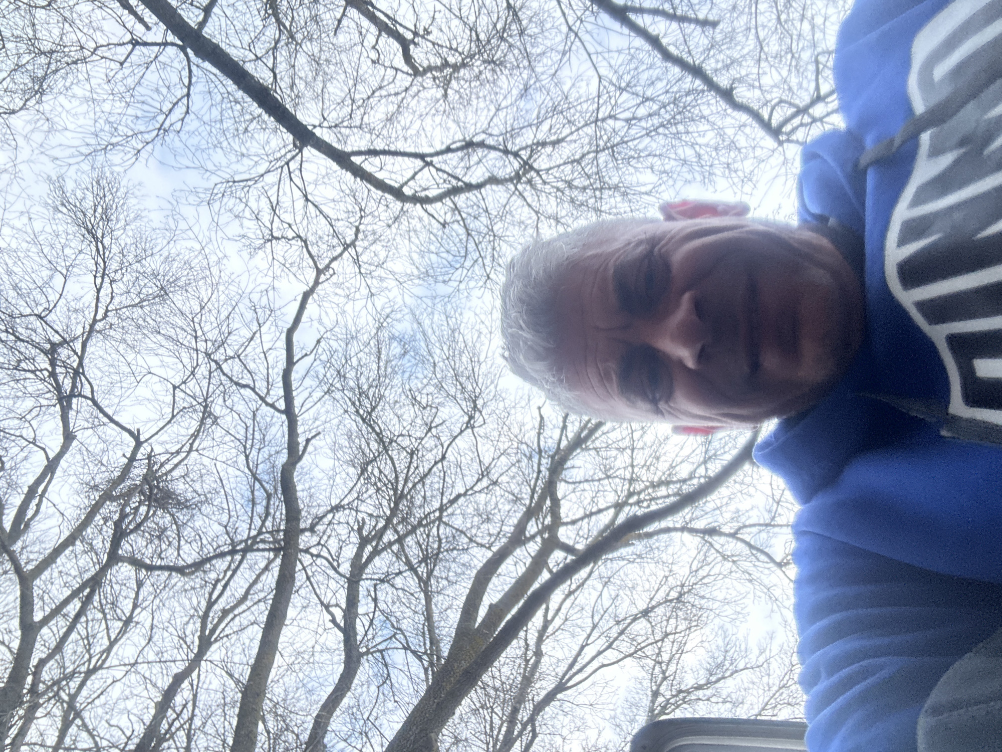 A close-up, upward-angled photograph depicts a man with gray hair, partially visible face, and wearing a blue hooded sweatshirt with black and white details. The background reveals bare tree branches against a light sky. The location in the city of Kiten, Bulgaria, is not discernible from the visual elements of the photograph. The man seems to be taking a selfie. The interaction consists of the man taking a photo of himself.
