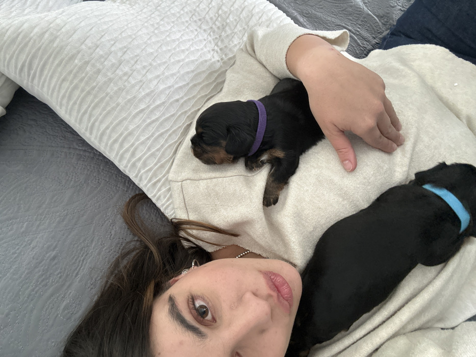 A woman with brown hair and light skin lies on a gray quilted bed next to a large white pillow. She wears a light beige sweater and has two small black and tan puppies with colored collars resting on her chest. One puppy has a purple collar, the other a blue collar. The woman looks towards the camera with one eye visible and a slight smile.