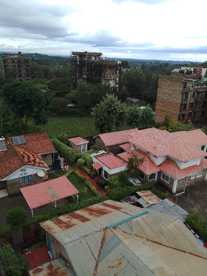 The image depicts an elevated view of a residential and mixed-use area in Olkeri ward, Kenya, under an overcast sky. In the immediate foreground, corrugated metal rooftops, some with visible rust, slant downwards from the bottom edge. The midground features a cluster of residential structures, predominantly single-family homes or smaller multi-unit dwellings, characterized by red tiled roofs and white or stone/brick facades. Several properties exhibit manicured green lawns, shrubbery, and paved pathways. One house features solar panels on its red roof and a satellite dish on an exterior wall. Small outbuildings with red roofs are visible within some properties. Adjacent to these residences is a large, irregularly shaped green agricultural field or undeveloped plot. In the background, multiple multi-story buildings are visible. To the left and center-left, two prominent structures appear to be either under construction or in a state of disrepair, featuring exposed concrete frames and scaffolding. To the right, another multi-story building with a reddish-brown brick facade stands. Beyond these structures, a distant horizon reveals further buildings and an expanse of green landscape under the cloudy sky. A white vehicle is partially discernible through trees in the mid-background. No individuals or specific actions are discernible within the frame.