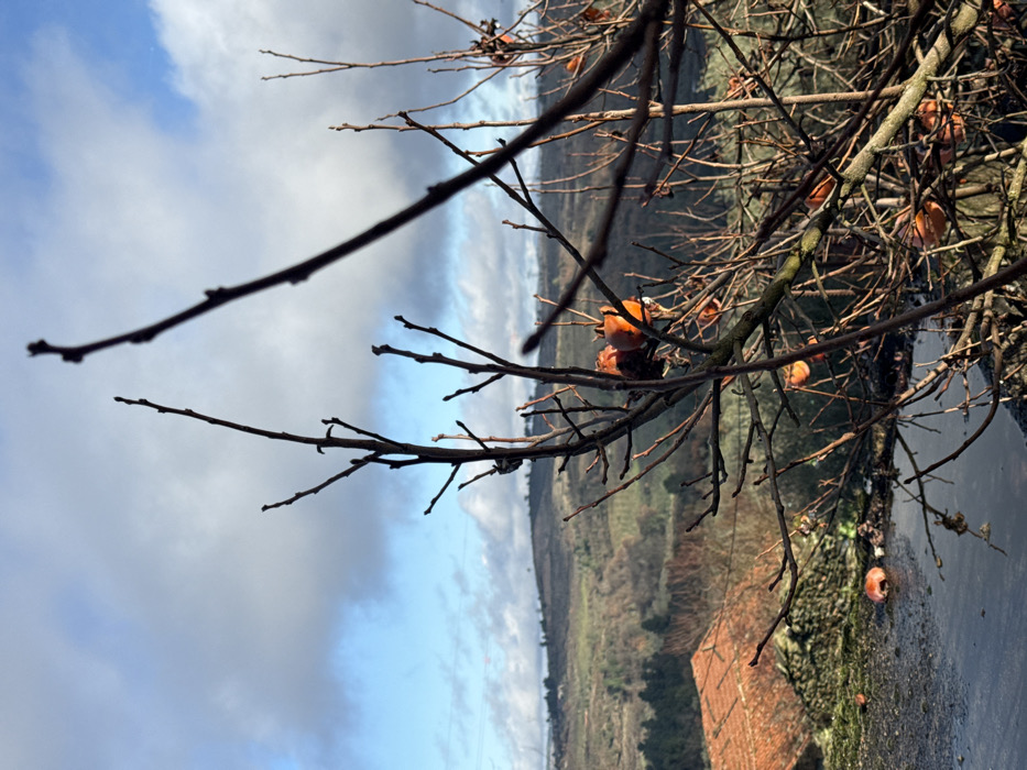 The image displays an outdoor scene in Freixo de Espada à Cinta, Portugal, characterized by a deciduous tree in the foreground. This tree, likely a persimmon, is leafless, exhibiting a dense network of bare branches. Several orange, globose fruits, some appearing shriveled, remain attached to its branches. In the lower-left quadrant, below the tree, a dark, reflective surface, identified as a puddle of water, contains at least two fallen orange fruits. A portion of a terracotta-tiled roof is visible immediately behind and to the left of this puddle. The midground consists of a rolling landscape with hills and valleys, sparsely covered by vegetation consistent with late autumn or winter, featuring a mix of brown, grey, and some evergreen hues. The background is a sky with patches of bright blue interspersed with white and light grey cumulus clouds. No people or specific activities are visible.