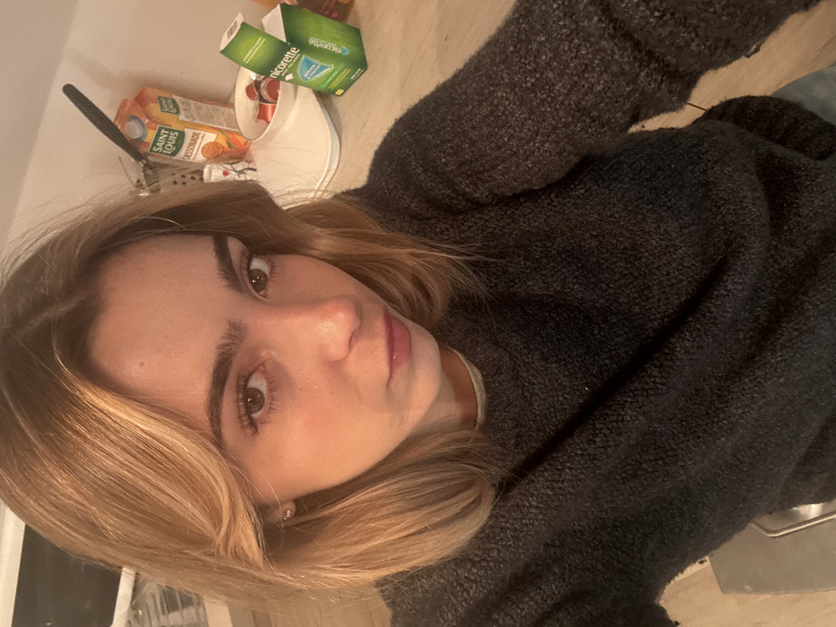 A female individual is depicted in a close-up, high-angle selfie taken indoors. The scene is located in Villeurbanne, France. She has shoulder-length, light brown hair parted in the center, light brown eyes, full eyebrows, and wears small stud earrings. Her lips are slightly parted, displaying a darker lip color, and her expression is neutral, directed at the camera. She is wearing a dark gray, textured knit sweater over a lighter, possibly off-white, inner garment. In the background, on a light-colored surface, various household items are visible: a yellow-orange carton labeled "Saint Louis CASSonade," a white bowl containing several reddish-brown capsules or small items, a black-handled utensil, and an open green and white box of "Nicorette," a nicotine replacement therapy product. The background wall is light-colored.