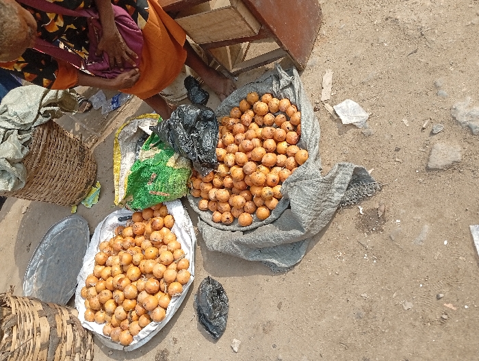 The photo depicts a street market with two piles of round, orange fruits contained in white and gray bags