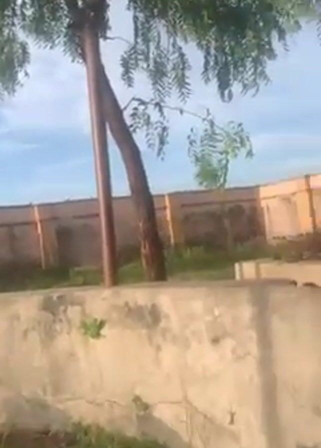slightly overgrown outdoor area with several square concrete blocks, a low concrete wall, and a taller wall topped with what appears to be barbed wire. A few trees are scattered around, and the sky is visible with some clouds. There is also a brown, cylindrical pole or pipe standing upright. The scene appears to be still, and there are no visible people or interactions.