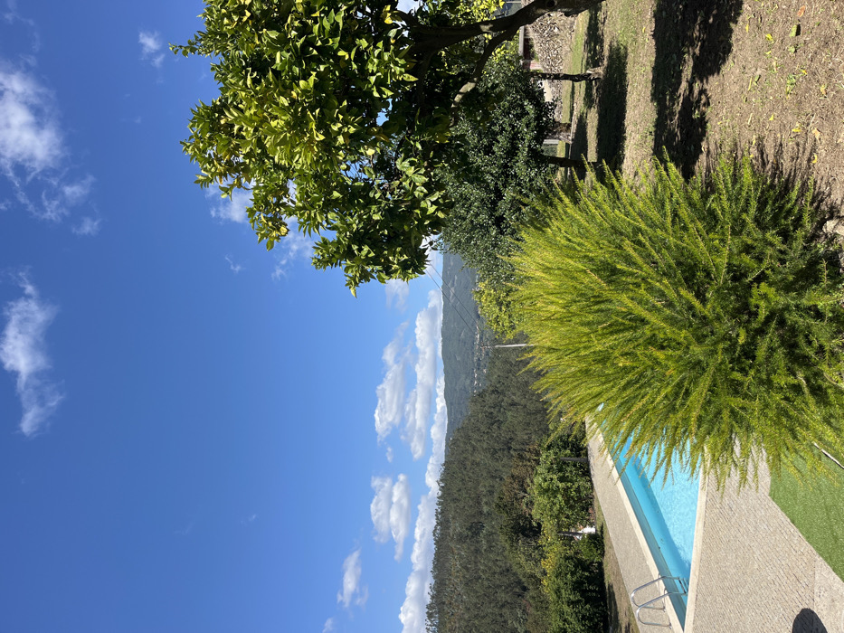 The image depicts an outdoor scene in Oliveira de Frades, Portugal, under a clear blue sky with scattered white cumulus clouds. A rectangular swimming pool, filled with light blue water, is positioned on the left-midground, surrounded by grey paver stones. A two-step stainless steel ladder extends into the pool from its shallow end. In the immediate foreground, a dense, bright green bush with fine, needle-like foliage occupies the lower center. To the right of the bush, a dry earth patch is visible with several distinct shadows cast by trees. In the midground, a large, leafy tree with lighter green foliage stands on the far right, partially cropped, with other smaller green trees behind the prominent bush. The background features rolling hills densely covered in dark green forest, extending to distant, hazy mountain ranges. A power line is faintly visible traversing the mid-distance above the treeline. No people or animals are present.