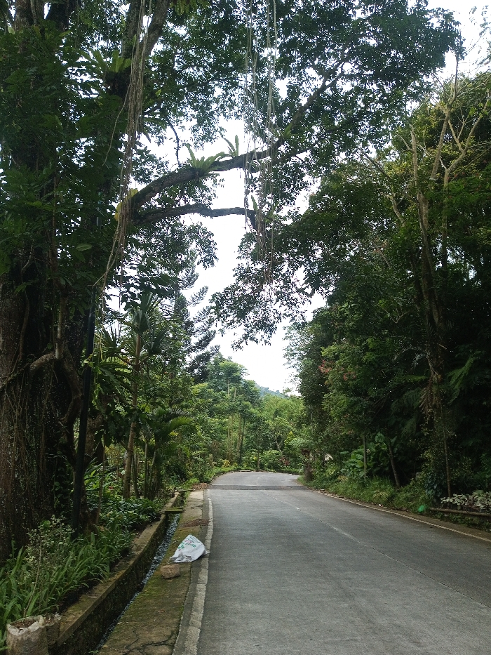 The image depicts a paved road winding through a densely vegetated rural environment in Hasanparthy mandal, India. The road, appearing to be concrete or asphalt, curves gently to the left and slopes slightly uphill, disappearing into the distance. It lacks visible traffic or markings. On the left side of the road, a concrete drainage channel or culvert runs parallel to the pavement. Moss and sparse vegetation are visible within and around this channel. A discarded white plastic bag rests on the edge of the channel near the foreground. The surrounding area is characterized by abundant, vibrant green foliage, indicative of a tropical or subtropical climate. Large, mature trees with thick trunks and extensive canopies dominate both sides of the road, particularly on the left, where a prominent tree features numerous aerial roots or vines hanging vertically. Several epiphytic plants, resembling Bird's Nest Ferns, are visible growing on the branches of the trees overhead. Dense undergrowth and smaller trees line the road, forming a green canopy that partially obscures the sky. The sky itself appears overcast or bright white, suggesting diffused lighting. No people, animals, or structures are visible within the frame.