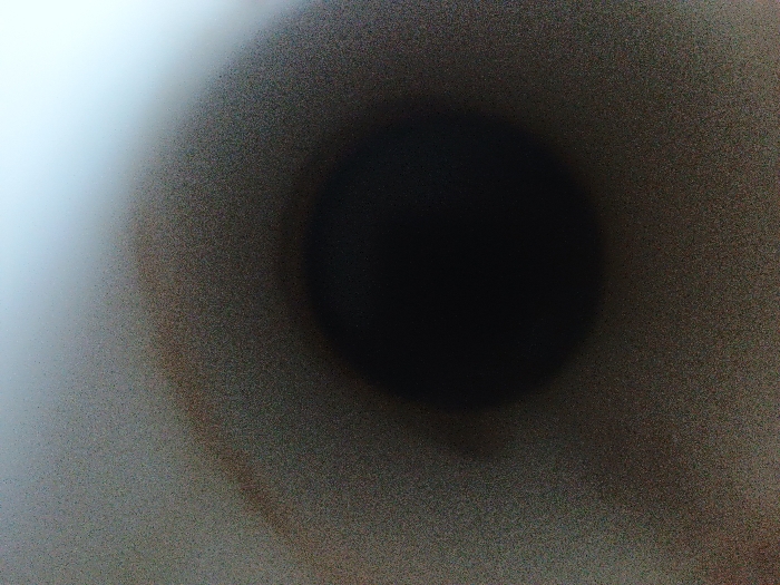 This image, originating from Levice, Slovakia, presents an abstract, grainy visual field. A deep black, circular void dominates the center. This void is encircled by a textured, speckled surface exhibiting a gradient from dark grey-brown near the center to light grey-white in the upper-right quadrant. A distinct curvilinear reddish-brown discoloration is visible in the upper-left, arching above the central void. The illumination source appears to be positioned above and to the right. No discernible individuals, specific objects, or actions are present; the scene is comprised solely of abstract light, shadow, and surface texture.