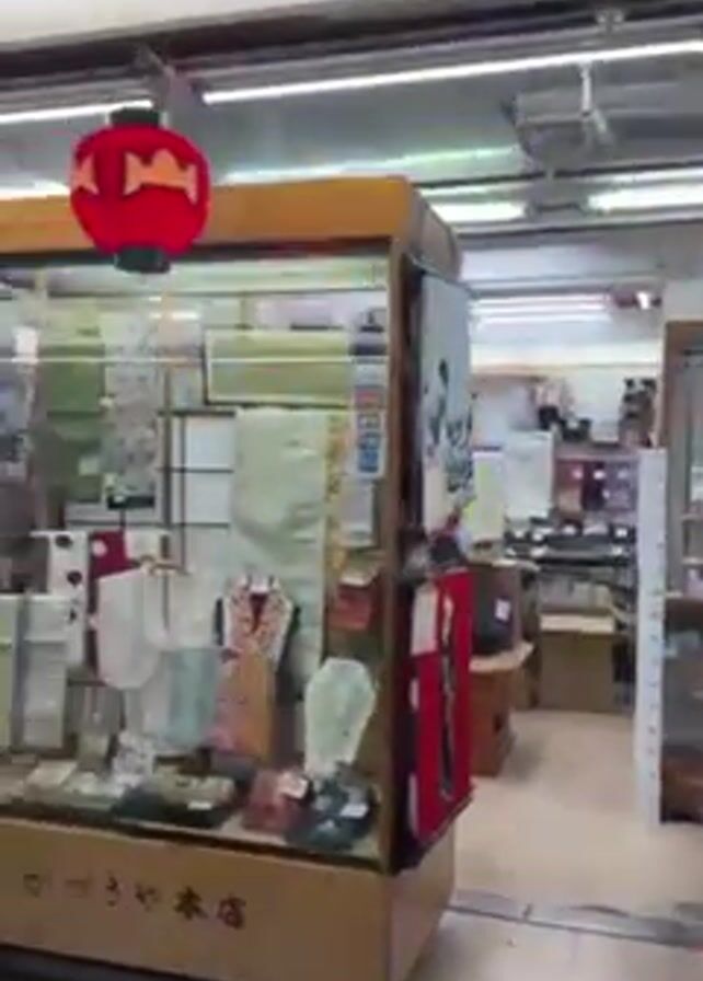 street scene in Japan at night. The camera starts in front of a shop with traditional Japanese decorations, including a green flower symbol and Japanese characters on the sign. The shop displays various items such as kimonos and other cultural goods. The camera then moves to the street, showing a bustling walkway lined with shops. People are walking in both directions, some wearing masks. The area is decorated with illuminated cherry blossom-like structures overhead, adding to the festive atmosphere. The overall impression is a lively market scene in Japan at night.