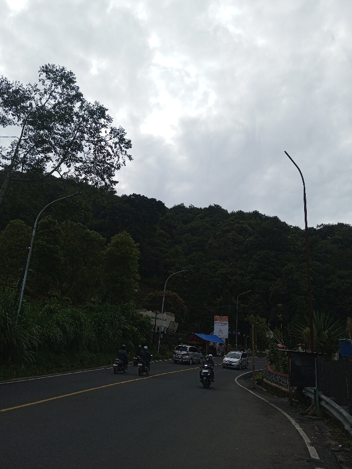 A gray overcast sky hangs over a winding asphalt road. Lush, green vegetation covers a hillside, punctuated by tall trees. Several vehicles are visible, including cars and motorbikes traveling on the road. Streetlights line the roadside, adding to the urban-meets-nature aesthetic. A prominent billboard with text adds to the visual complexity of the scene.