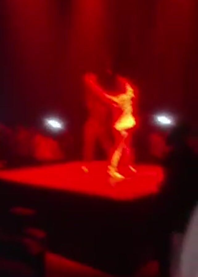stage performance in front of a crowd. A person in a light-colored outfit is dancing on a circular stage lit with red and blue lights. Another person then comes onto the stage and lifts the first person up into the air. They continue to perform together, rotating and moving across the stage while suspended in the air. The crowd is visible in the background, and there are several individuals standing near the stage filming the performance. The lighting shifts between red and blue throughout the video.
