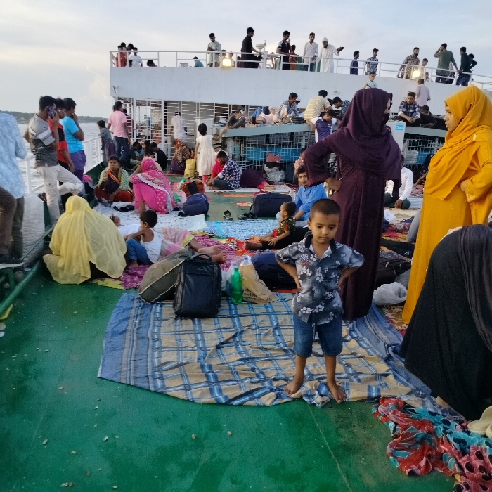A crowded ferry is filled with people. Several individuals are standing on an upper deck, while others are sitting or standing on the main deck. Many of the seated individuals are on blankets or mats. In the foreground, a young boy with bare feet stands on a blue and white checkered blanket with his hands on his hips. To his right stand two women in a purple hijab and a yellow hijab respectively. Suitcases and bags are scattered around.