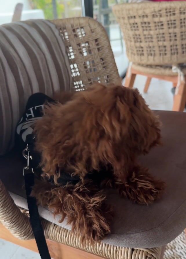 A brown curly-haired dog is sitting on a chair. The dog is wearing a black harness and leash. The dog sticks its tongue out, then turns its head down to rest. The chair is made of wood and has a woven back and seat. There is another person seated in the background in a wicker chair. A window is visible in the background. The scene appears to be in a cafe or restaurant.
