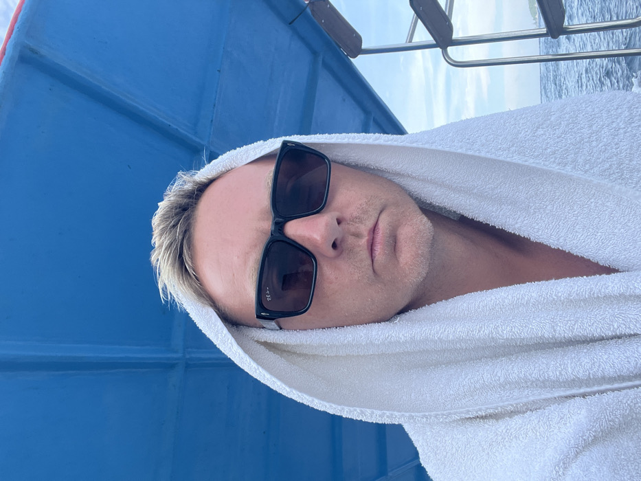 A man with fair skin and blond hair is wearing sunglasses and a white towel draped over his head. He appears to be on a boat, evidenced by the blue exterior of the vessel visible on the left, and a glimpse of the sea and a boarding ladder behind him. His expression is neutral.