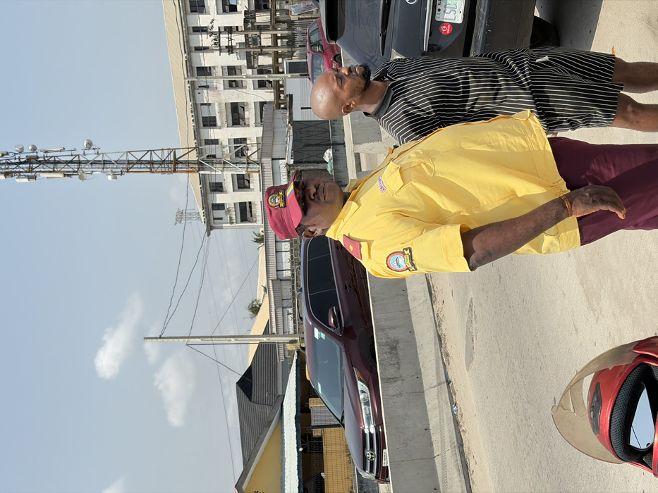 An outdoor scene in Jakande, Nigeria, depicts two men standing on a paved surface next to a concrete barrier under bright daylight. In the foreground, a red motorcycle helmet with a clear visor rests on the bottom-left. The primary subject, on the left, is a dark-skinned man of substantial build, wearing a yellow short-sleeved uniform shirt with red epaulets and a patch on the left arm featuring a ship emblem and text (likely "LASTMA" for Lagos State Traffic Management Authority), dark red trousers, and a matching red cap with an insignia. He has a dark mustache and goatee, and a light brown wristband on his right wrist, looking slightly to his left. To his right and slightly behind him stands a bald, dark-skinned man of medium build, wearing a black and white vertically striped short-sleeved collared shirt and matching shorts, looking straight ahead. Behind the concrete barrier, a dark red SUV (likely a Toyota Highlander) and a black sedan with a "LSD" prefix license plate and a small Turkish flag sticker are visible. In the background, an urban environment features a tall metal telecommunications mast with multiple antennae dominating the center-right. To the left, residential-style buildings with dark roofs are seen, along with a utility pole. Behind the mast is a large, multi-story building with numerous windows, some appearing vacant or damaged. The sky is clear with minimal clouds. No direct interaction is observed between the two men.